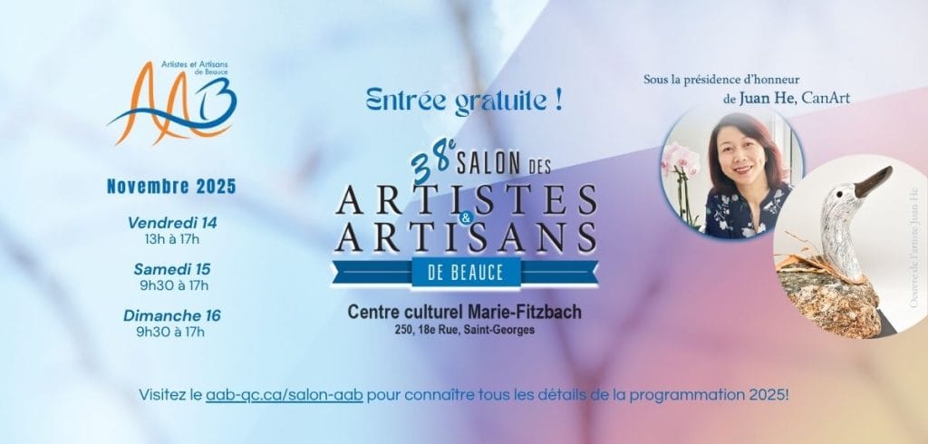 C’est avec grand plaisir qu’ AAB ainsi que les membres du comité du Salon des Artistes et Artisans de Beauce vous convient à la 38e édition du Salon des Artistes et Artisans de Beauce qui se tiendra les 14, 15 et 16 novembre prochain au 3e et 4e étage du Centre Culturel Marie-Fitzbach de Saint-Georges.